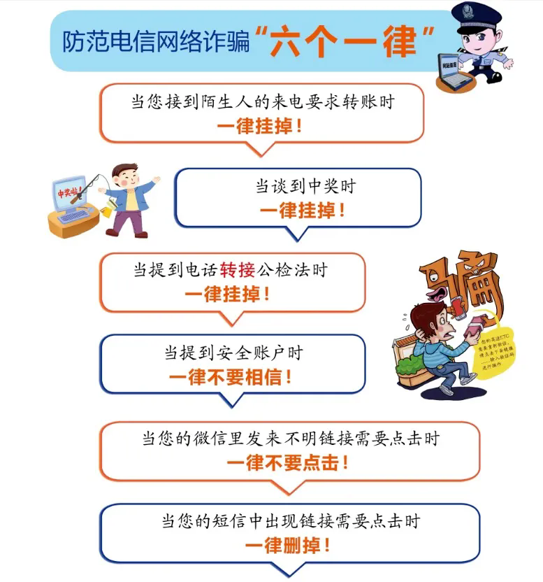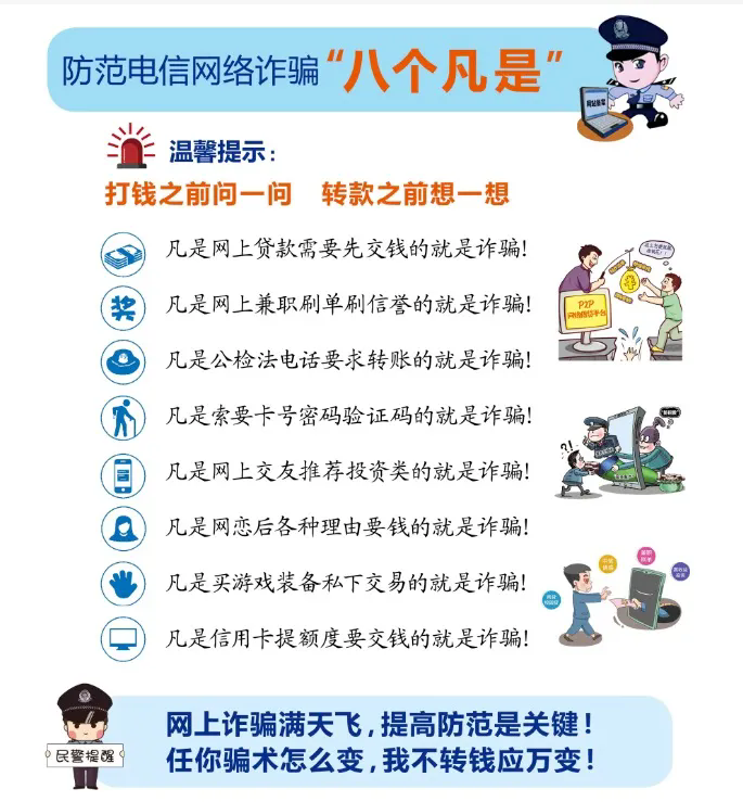 当今社会,伴随着信息技术的不断进步,电信诈骗案件频频发生,各种新型电信诈骗犯罪形式层出不穷。为了大家的财产安全,提高“反诈防诈”的安全意识,时刻拉响警钟,防范电信诈骗,形成坚实的社会防范基础。以下防范诈骗知识请一定牢记!并将此信内容转告您的亲友。