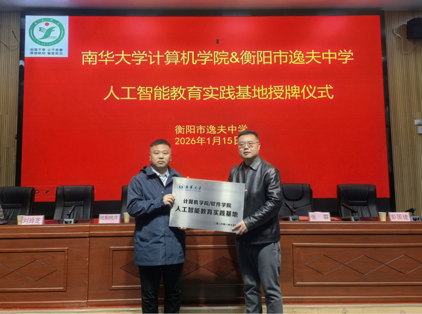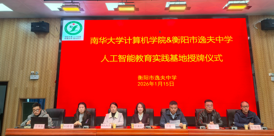 1月15日下午,南华大学人工智能教育实践基地落户衡阳市逸夫中学。该基地授牌仪式在衡阳市逸夫中学多功能报告厅隆重举行。衡阳市教育局党组成员、副局长汪美玲,南华大学计算机学院院长万亚平、副院长欧阳纯萍,衡阳市逸夫中学党总支书记张霖、校长刘玲芝及师生代表共同出席。