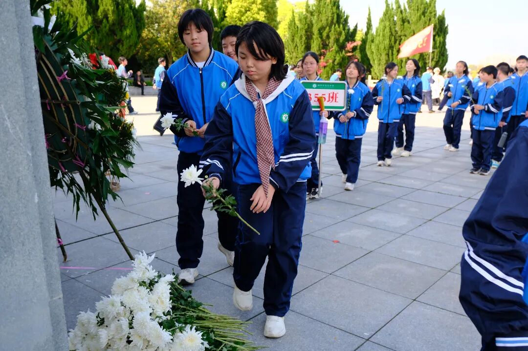 吴瑞发副校长在仪式上发表讲话。他详细介绍了衡阳光荣厚重的抗战历史,深刻阐述了革命先烈浴血奋战、坚守家国的英雄事迹,勉励同学们铭记这段悲壮历史,珍惜当下幸福生活,把爱国情、强国志、报国行融入日常学习,以实际行动传承英烈精神;学生代表356班俞学堃现场献词,声音铿锵有力,表达了对先烈的崇敬与缅怀,勇担时代使命的坚定决心,立下勤奋学习、勇担使命的青春誓言。最后,全体师生依次敬献白花,以最庄重的方式寄托追思。